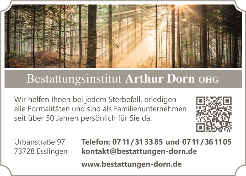Seit über 50 Jahren ist das Bestattungsinstitut Arthur Dorn in Esslingen, Aichwald und Umgebung für Sie im Dienst. Nach unserem Leitspruch „Ehre den Toten – Dienst den Lebenden“ sind wir mit unserem Team Ihr vertrauenswürdiger Partner und zuverlässiger Ansprechpartner in den schwersten Zeiten.