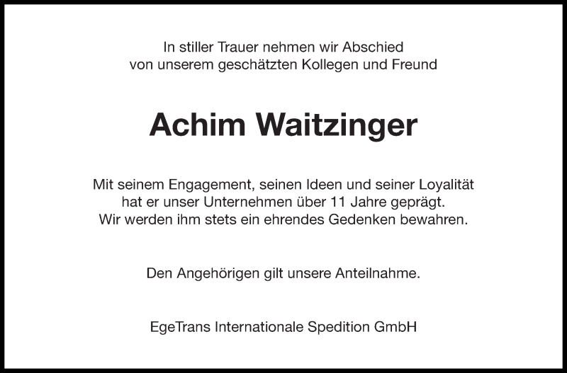Hier finden Sie alle Traueranzeigen aus der Zeitung, die bisher für Achim Waitzinger erschienen sind. Weitere Traueranzeigen, die in der Zeitung erscheinen, werden hier ebenfalls aufgelistet