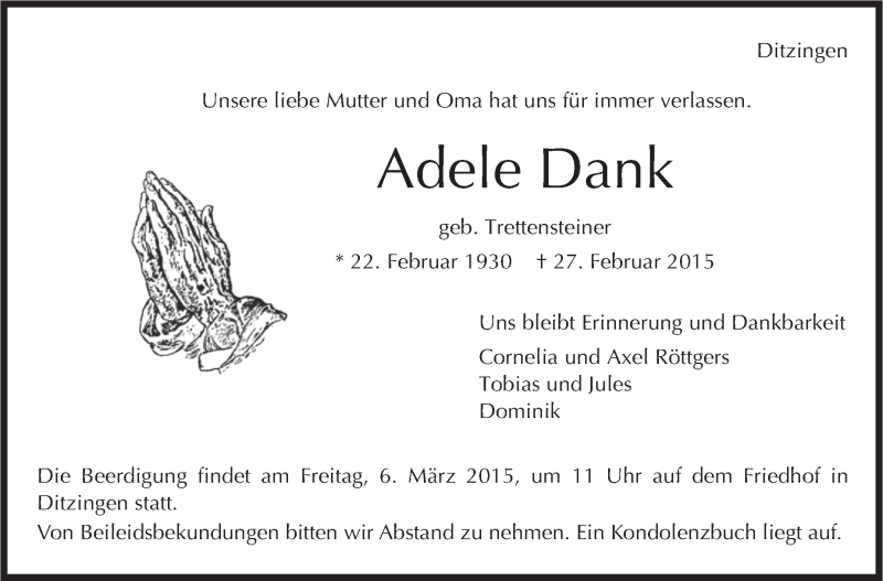 Hier finden Sie alle Traueranzeigen aus der Zeitung, die bisher für Adele Dank erschienen sind. Weitere Traueranzeigen, die in der Zeitung erscheinen, werden hier ebenfalls aufgelistet