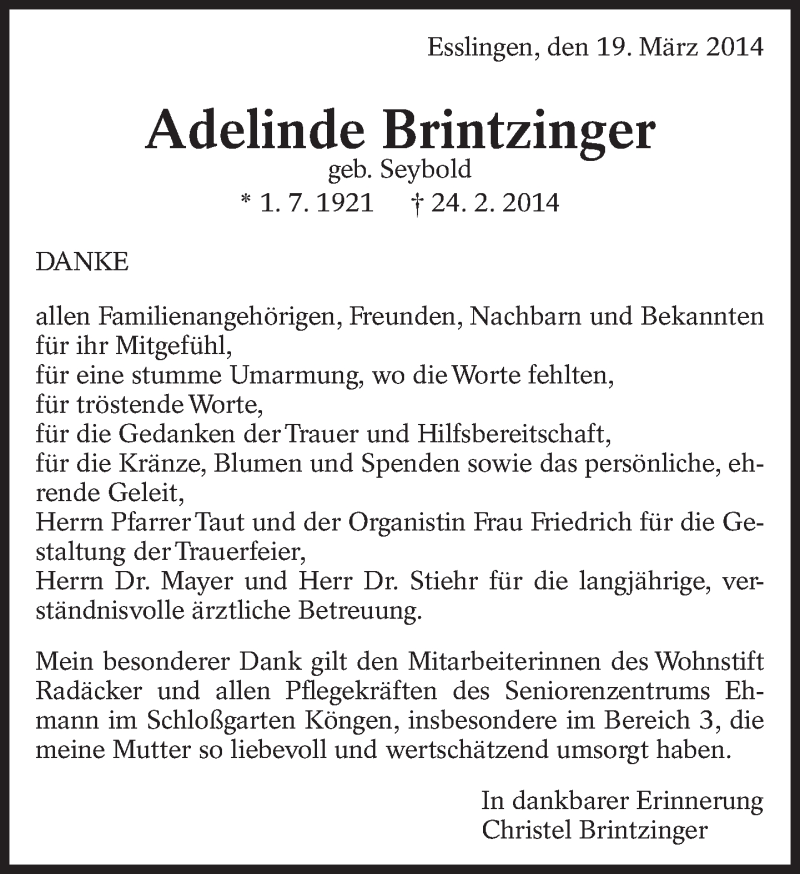 Hier finden Sie alle Traueranzeigen aus der Zeitung, die bisher für Adelinde Brintzinger erschienen sind. Weitere Traueranzeigen, die in der Zeitung erscheinen, werden hier ebenfalls aufgelistet