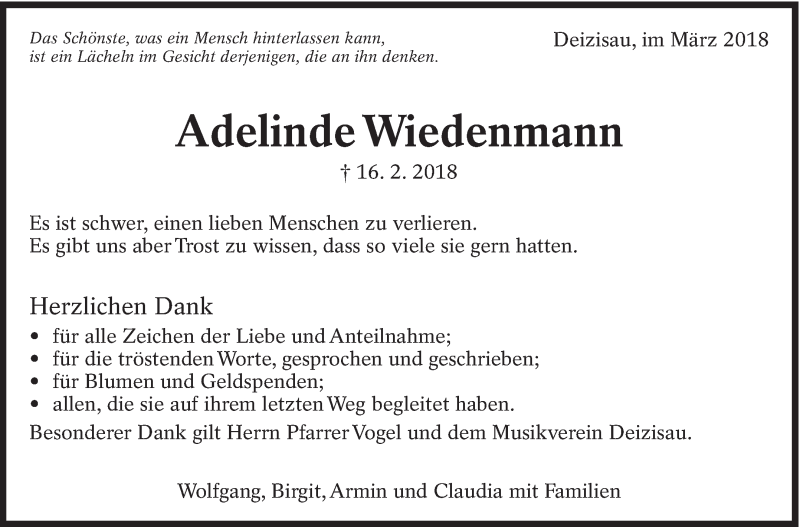 Hier finden Sie alle Traueranzeigen aus der Zeitung, die bisher für Adelinde Wiedenmann erschienen sind. Weitere Traueranzeigen, die in der Zeitung erscheinen, werden hier ebenfalls aufgelistet