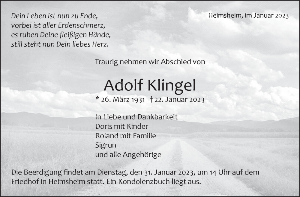 Hier finden Sie alle Traueranzeigen aus der Zeitung, die bisher für Adolf Klingel erschienen sind. Weitere Traueranzeigen, die in der Zeitung erscheinen, werden hier ebenfalls aufgelistet
