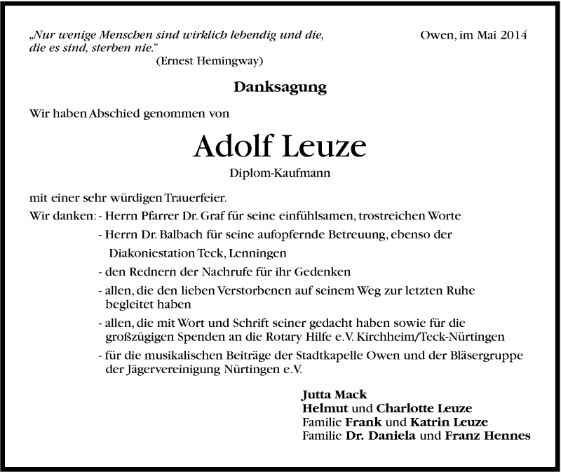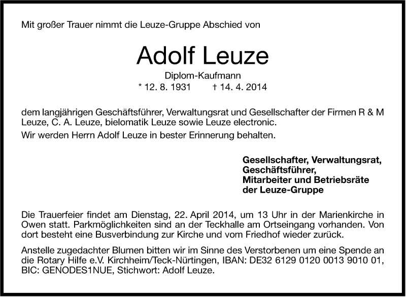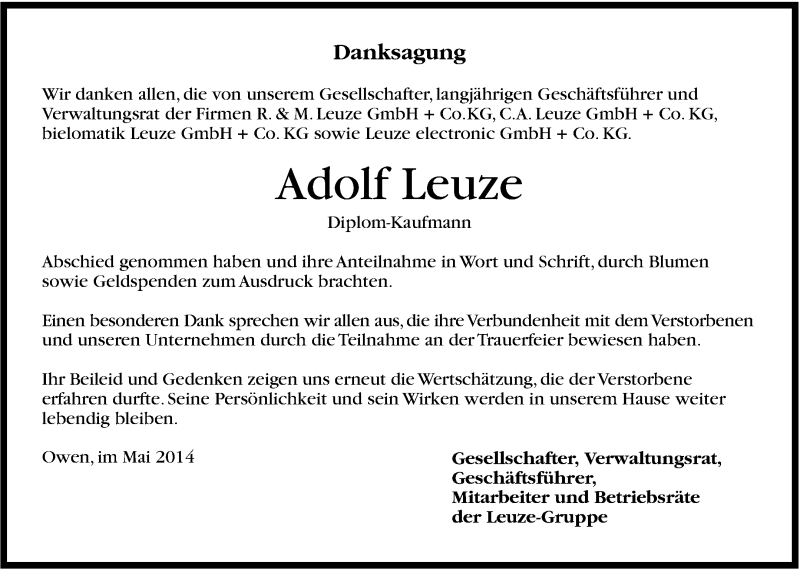 Hier finden Sie alle Traueranzeigen aus der Zeitung, die bisher für Adolf Leuze erschienen sind. Weitere Traueranzeigen, die in der Zeitung erscheinen, werden hier ebenfalls aufgelistet