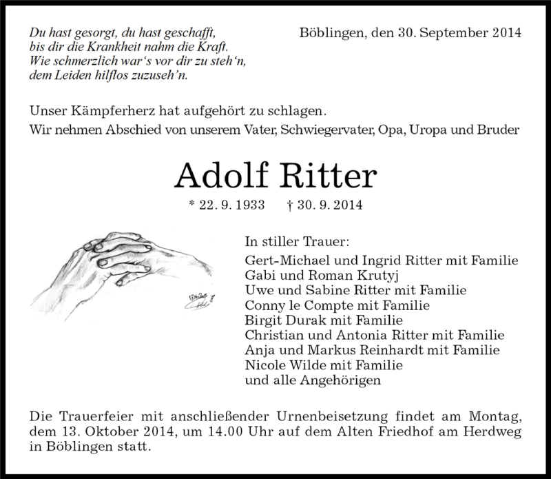 Hier finden Sie alle Traueranzeigen aus der Zeitung, die bisher für Adolf Ritter erschienen sind. Weitere Traueranzeigen, die in der Zeitung erscheinen, werden hier ebenfalls aufgelistet