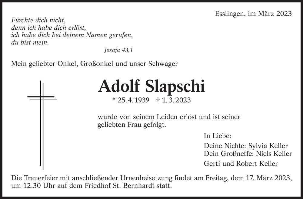 Hier finden Sie alle Traueranzeigen aus der Zeitung, die bisher für Adolf Slapschi erschienen sind. Weitere Traueranzeigen, die in der Zeitung erscheinen, werden hier ebenfalls aufgelistet
