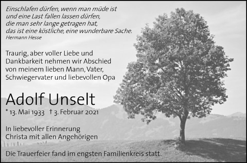 Hier finden Sie alle Traueranzeigen aus der Zeitung, die bisher für Adolf Unselt erschienen sind. Weitere Traueranzeigen, die in der Zeitung erscheinen, werden hier ebenfalls aufgelistet