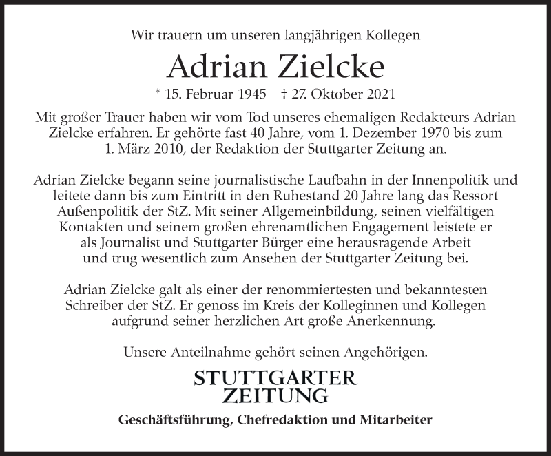 Hier finden Sie alle Traueranzeigen aus der Zeitung, die bisher für Adrian Zielcke erschienen sind. Weitere Traueranzeigen, die in der Zeitung erscheinen, werden hier ebenfalls aufgelistet
