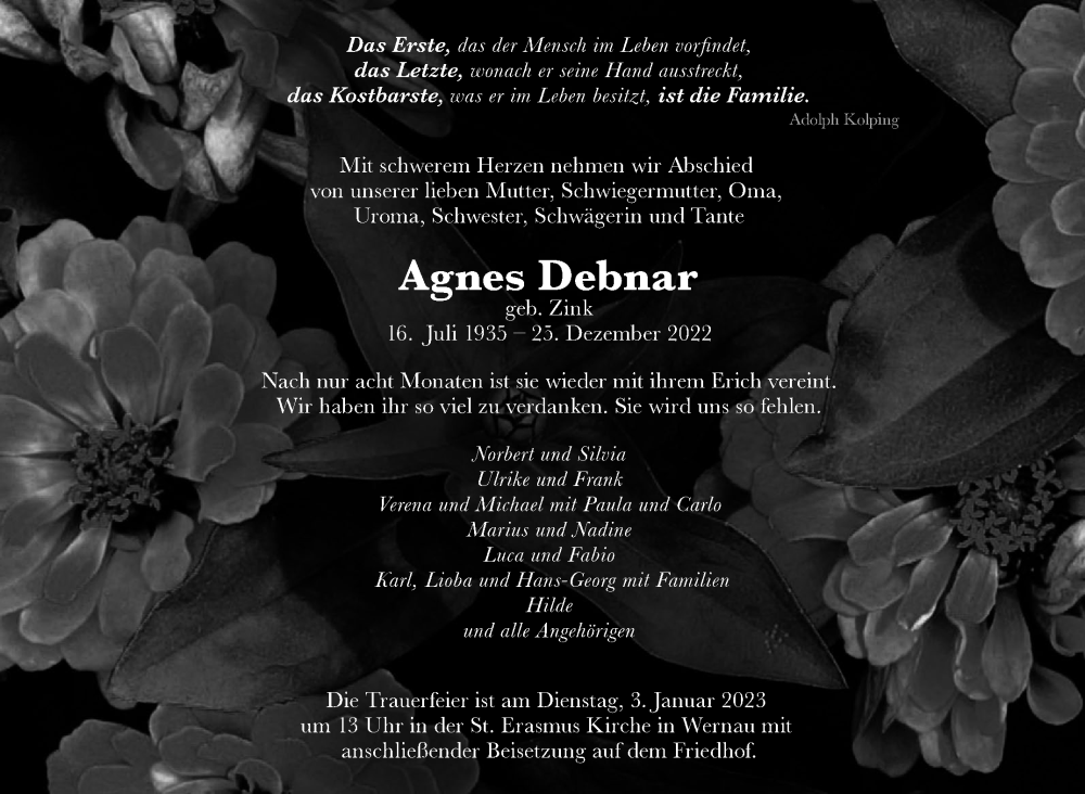 Hier finden Sie alle Traueranzeigen aus der Zeitung, die bisher für Agnes Debnar erschienen sind. Weitere Traueranzeigen, die in der Zeitung erscheinen, werden hier ebenfalls aufgelistet