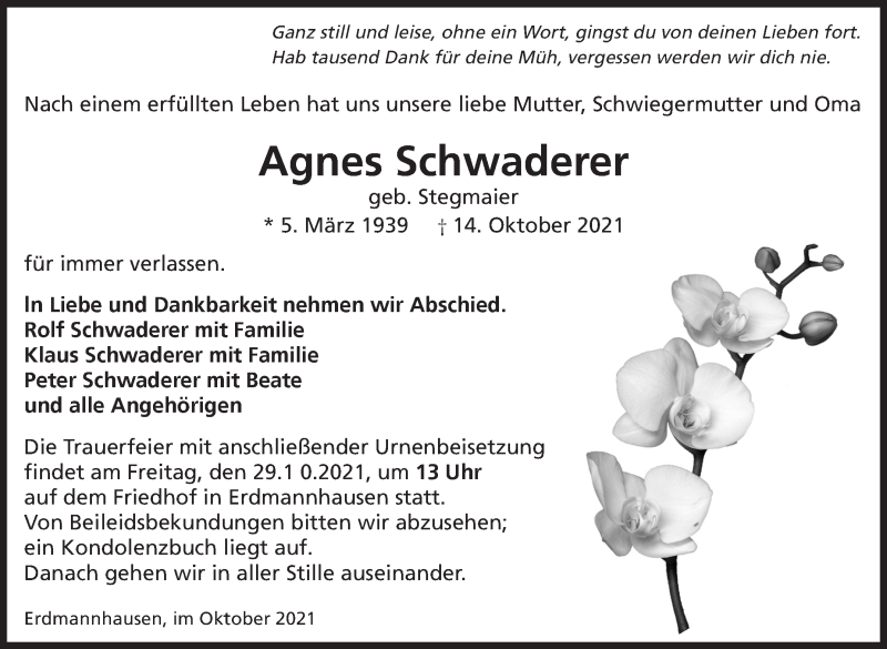 Hier finden Sie alle Traueranzeigen aus der Zeitung, die bisher für Agnes Schwaderer erschienen sind. Weitere Traueranzeigen, die in der Zeitung erscheinen, werden hier ebenfalls aufgelistet