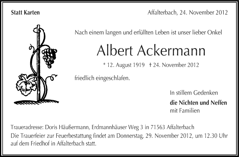 Hier finden Sie alle Traueranzeigen aus der Zeitung, die bisher für Albert Ackermann erschienen sind. Weitere Traueranzeigen, die in der Zeitung erscheinen, werden hier ebenfalls aufgelistet