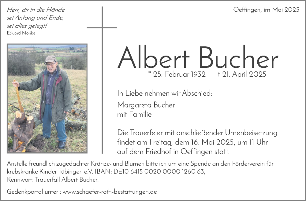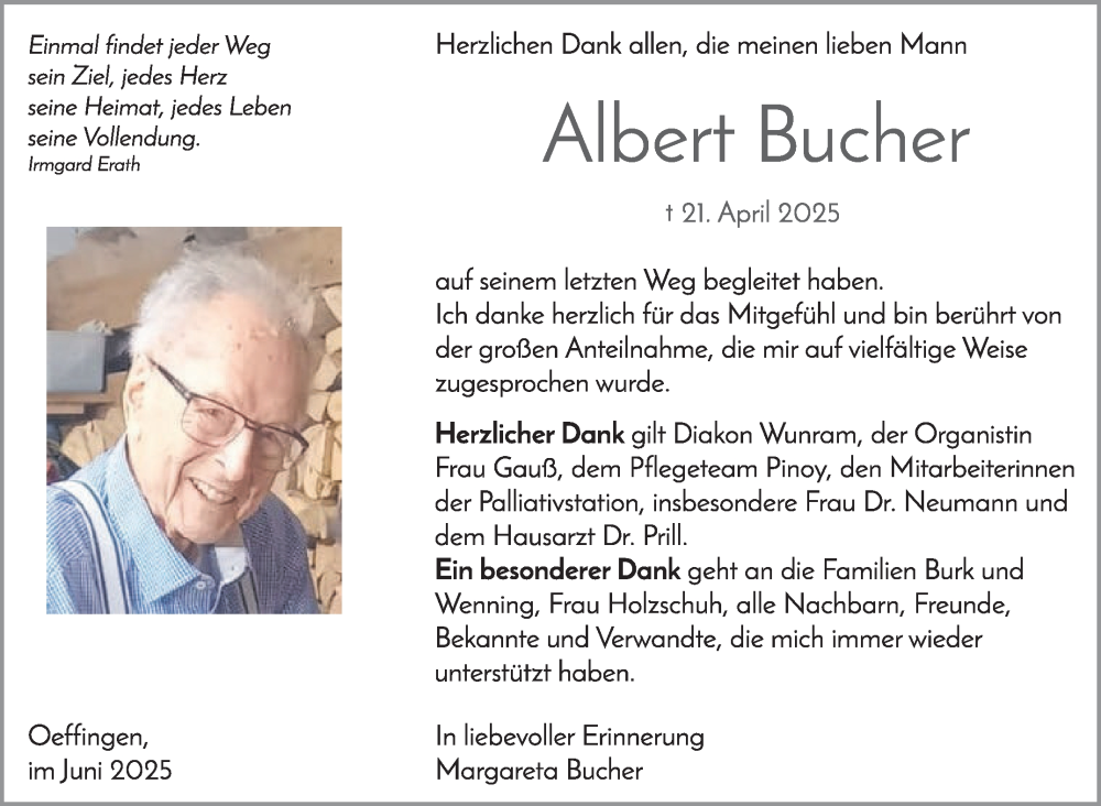 Hier finden Sie alle Traueranzeigen aus der Zeitung, die bisher für Albert Bucher erschienen sind. Weitere Traueranzeigen, die in der Zeitung erscheinen, werden hier ebenfalls aufgelistet