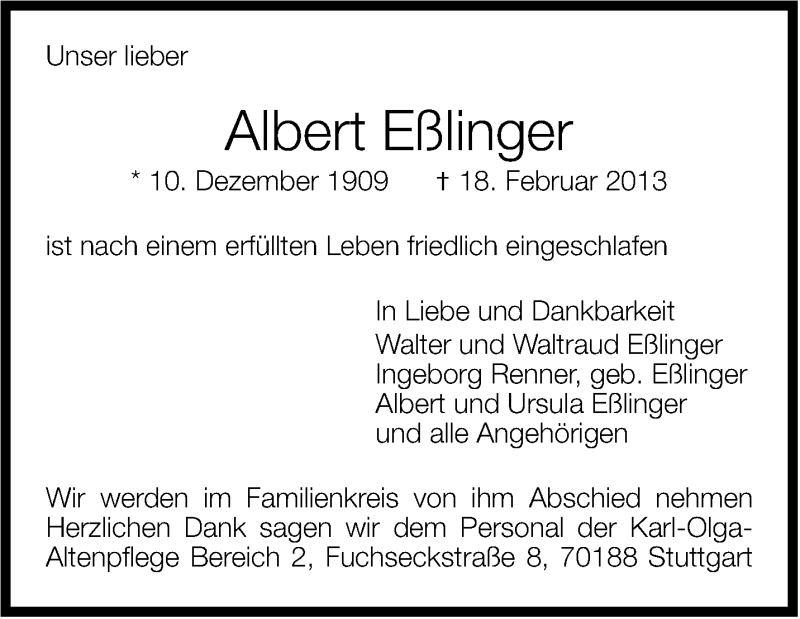 Hier finden Sie alle Traueranzeigen aus der Zeitung, die bisher für Albert Eßlinger erschienen sind. Weitere Traueranzeigen, die in der Zeitung erscheinen, werden hier ebenfalls aufgelistet