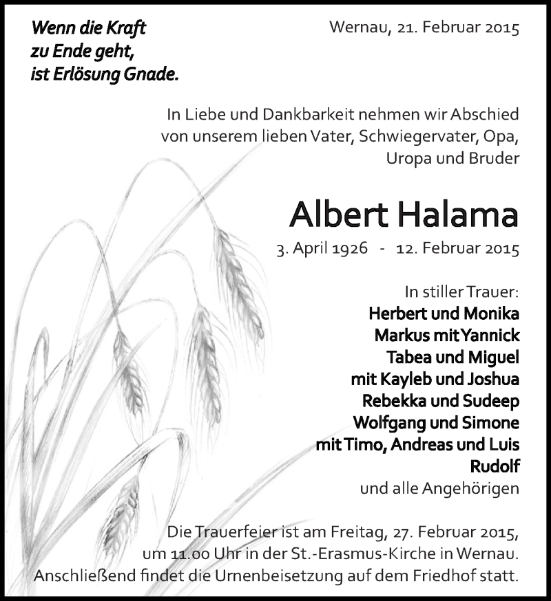 Hier finden Sie alle Traueranzeigen aus der Zeitung, die bisher für Albert Halama erschienen sind. Weitere Traueranzeigen, die in der Zeitung erscheinen, werden hier ebenfalls aufgelistet