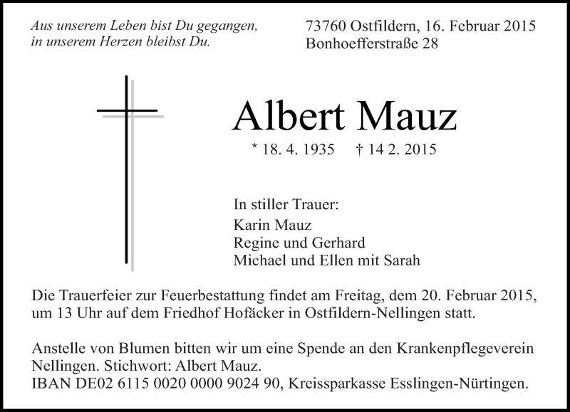 Hier finden Sie alle Traueranzeigen aus der Zeitung, die bisher für Albert Mauz erschienen sind. Weitere Traueranzeigen, die in der Zeitung erscheinen, werden hier ebenfalls aufgelistet