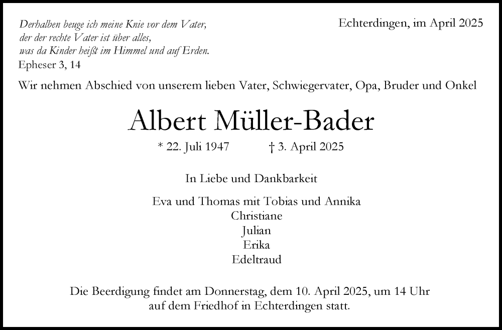 Hier finden Sie alle Traueranzeigen aus der Zeitung, die bisher für Albert Müller-Bader erschienen sind. Weitere Traueranzeigen, die in der Zeitung erscheinen, werden hier ebenfalls aufgelistet