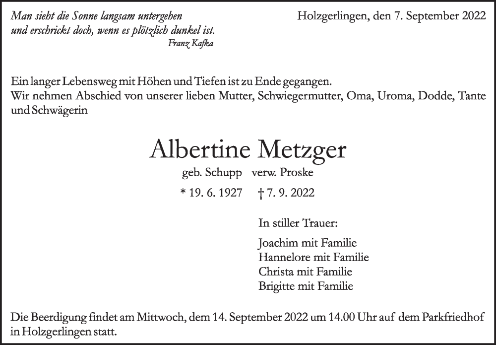 Hier finden Sie alle Traueranzeigen aus der Zeitung, die bisher für Albertine Metzger erschienen sind. Weitere Traueranzeigen, die in der Zeitung erscheinen, werden hier ebenfalls aufgelistet