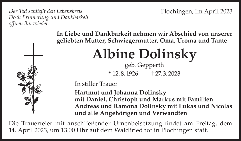 Hier finden Sie alle Traueranzeigen aus der Zeitung, die bisher für Albine Dolinsky erschienen sind. Weitere Traueranzeigen, die in der Zeitung erscheinen, werden hier ebenfalls aufgelistet