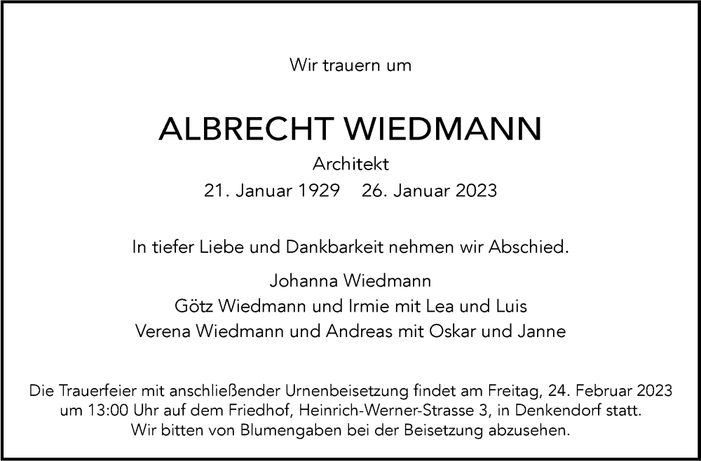 Hier finden Sie alle Traueranzeigen aus der Zeitung, die bisher für Albrecht Wiedmann erschienen sind. Weitere Traueranzeigen, die in der Zeitung erscheinen, werden hier ebenfalls aufgelistet