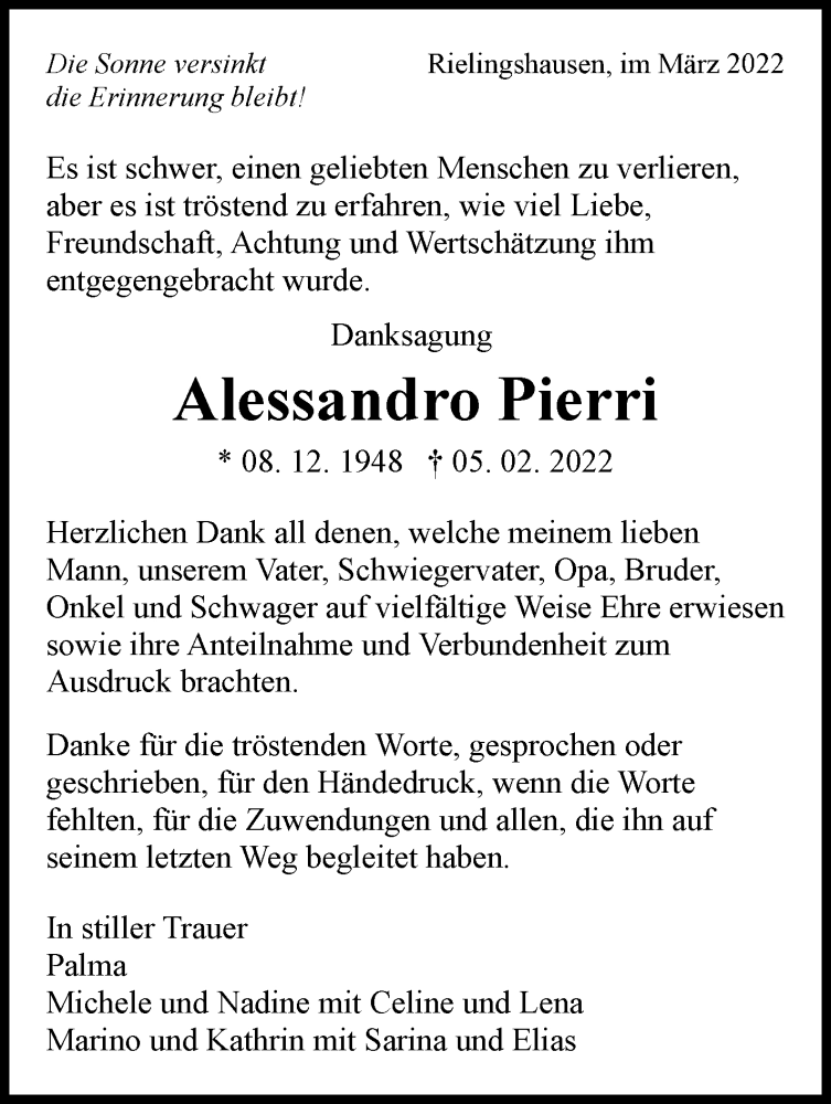 Hier finden Sie alle Traueranzeigen aus der Zeitung, die bisher für Alessandro Pierri erschienen sind. Weitere Traueranzeigen, die in der Zeitung erscheinen, werden hier ebenfalls aufgelistet