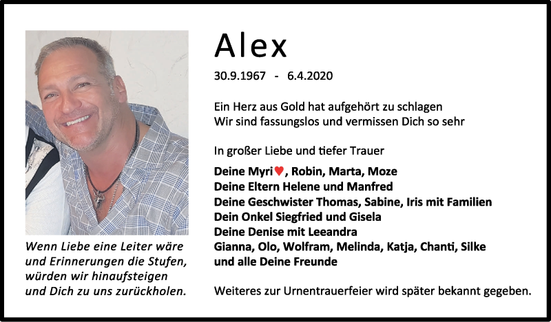 Hier finden Sie alle Traueranzeigen aus der Zeitung, die bisher für Alex erschienen sind. Weitere Traueranzeigen, die in der Zeitung erscheinen, werden hier ebenfalls aufgelistet