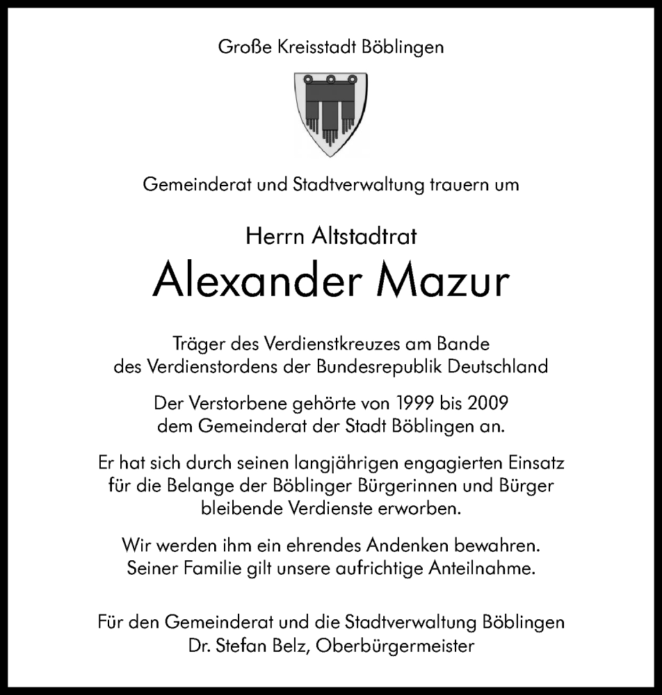 Hier finden Sie alle Traueranzeigen aus der Zeitung, die bisher für Alexander Mazur erschienen sind. Weitere Traueranzeigen, die in der Zeitung erscheinen, werden hier ebenfalls aufgelistet