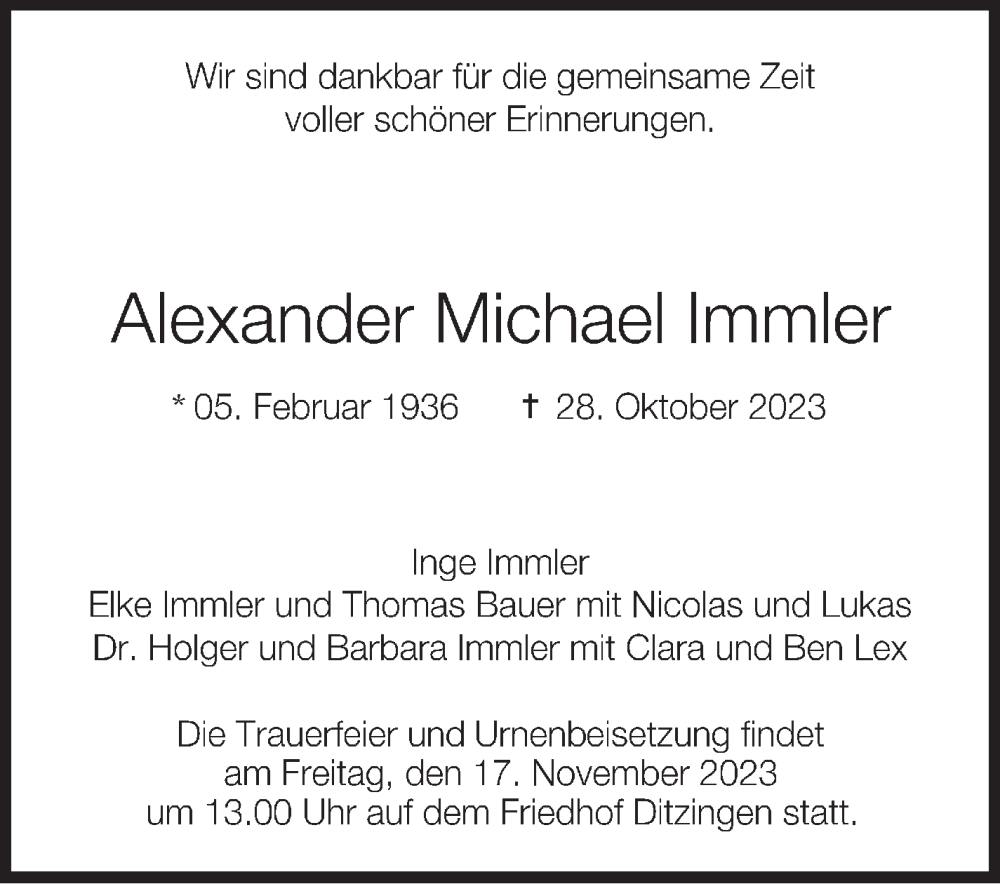 Hier finden Sie alle Traueranzeigen aus der Zeitung, die bisher für Alexander Michael Immler erschienen sind. Weitere Traueranzeigen, die in der Zeitung erscheinen, werden hier ebenfalls aufgelistet