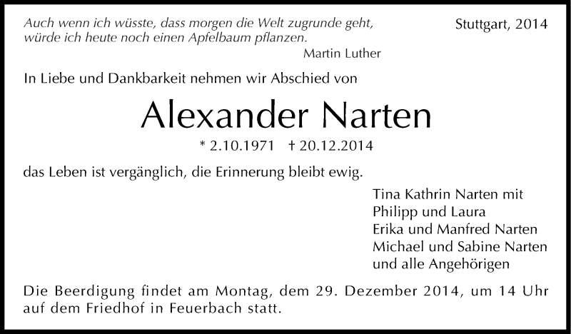 Hier finden Sie alle Traueranzeigen aus der Zeitung, die bisher für Alexander Narten erschienen sind. Weitere Traueranzeigen, die in der Zeitung erscheinen, werden hier ebenfalls aufgelistet