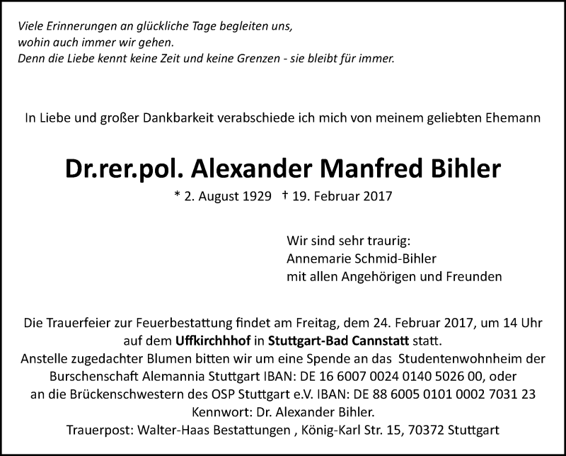 Hier finden Sie alle Traueranzeigen aus der Zeitung, die bisher für Alexander Manfred Bihler erschienen sind. Weitere Traueranzeigen, die in der Zeitung erscheinen, werden hier ebenfalls aufgelistet