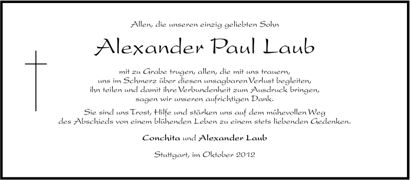 Hier finden Sie alle Traueranzeigen aus der Zeitung, die bisher für Alexander Paul Laub erschienen sind. Weitere Traueranzeigen, die in der Zeitung erscheinen, werden hier ebenfalls aufgelistet