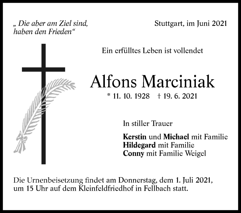 Hier finden Sie alle Traueranzeigen aus der Zeitung, die bisher für Alfons Marciniak erschienen sind. Weitere Traueranzeigen, die in der Zeitung erscheinen, werden hier ebenfalls aufgelistet