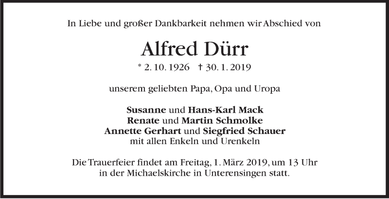 Hier finden Sie alle Traueranzeigen aus der Zeitung, die bisher für Alfred Dürr erschienen sind. Weitere Traueranzeigen, die in der Zeitung erscheinen, werden hier ebenfalls aufgelistet
