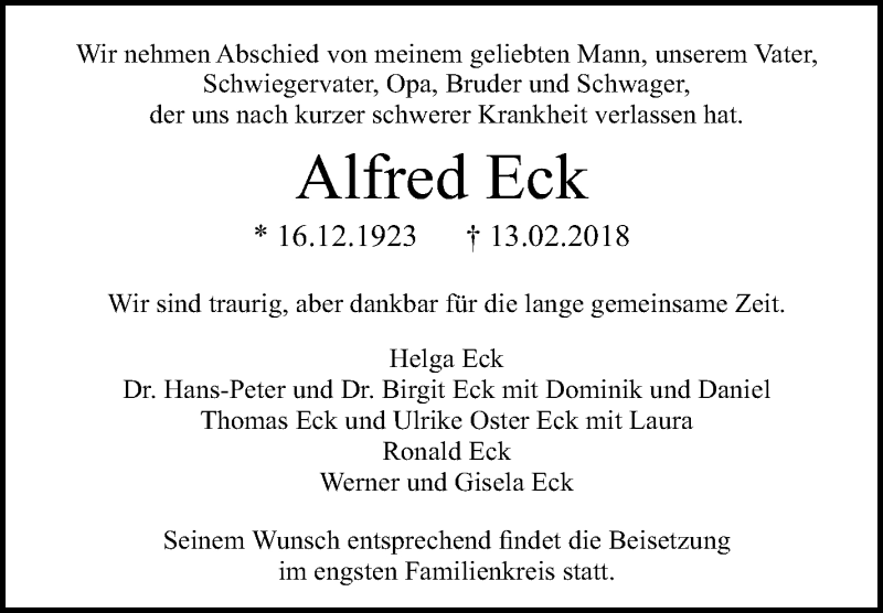 Hier finden Sie alle Traueranzeigen aus der Zeitung, die bisher für Alfred Eck erschienen sind. Weitere Traueranzeigen, die in der Zeitung erscheinen, werden hier ebenfalls aufgelistet