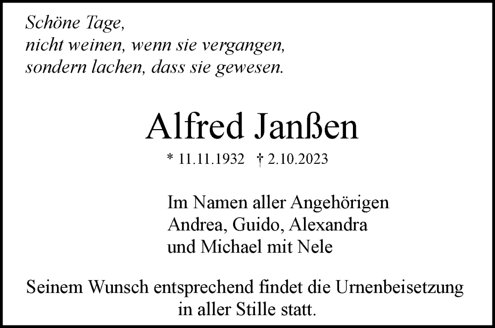 Hier finden Sie alle Traueranzeigen aus der Zeitung, die bisher für Alfred Janßen erschienen sind. Weitere Traueranzeigen, die in der Zeitung erscheinen, werden hier ebenfalls aufgelistet