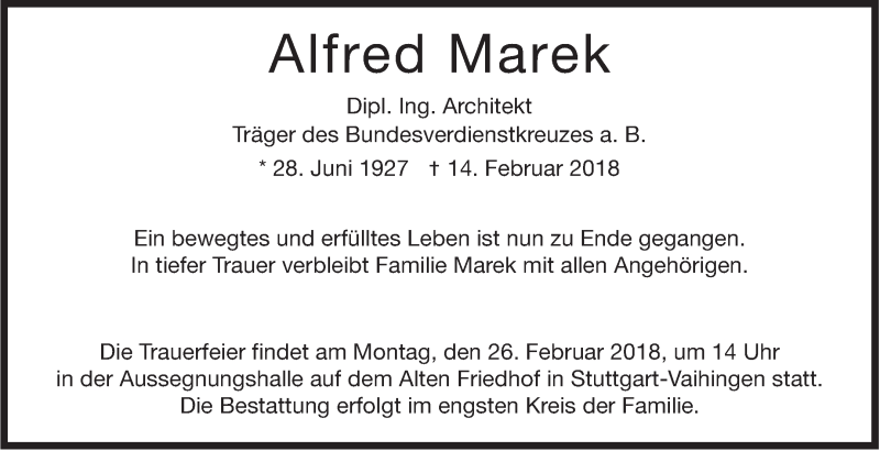 Hier finden Sie alle Traueranzeigen aus der Zeitung, die bisher für Alfred Marek erschienen sind. Weitere Traueranzeigen, die in der Zeitung erscheinen, werden hier ebenfalls aufgelistet