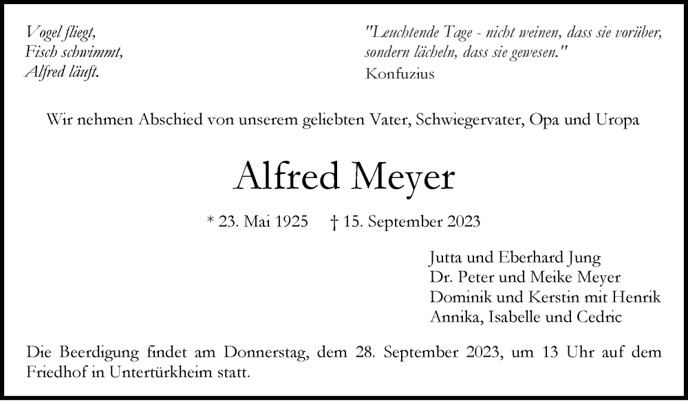 Hier finden Sie alle Traueranzeigen aus der Zeitung, die bisher für Alfred Meyer erschienen sind. Weitere Traueranzeigen, die in der Zeitung erscheinen, werden hier ebenfalls aufgelistet