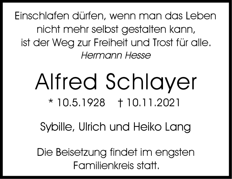 Hier finden Sie alle Traueranzeigen aus der Zeitung, die bisher für Alfred Schlayer erschienen sind. Weitere Traueranzeigen, die in der Zeitung erscheinen, werden hier ebenfalls aufgelistet