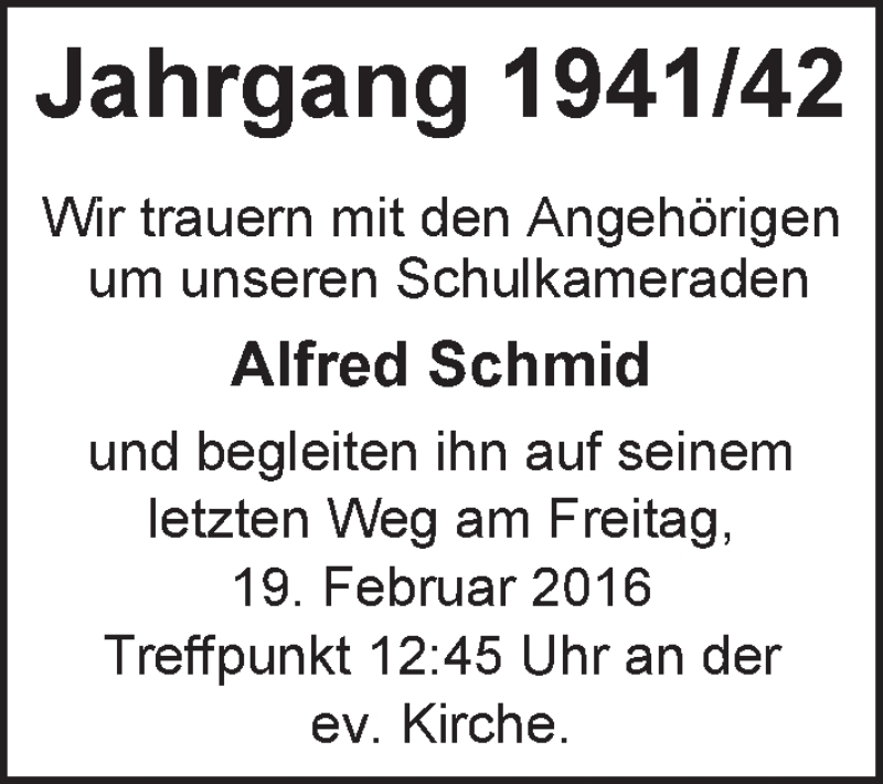 Hier finden Sie alle Traueranzeigen aus der Zeitung, die bisher für Alfred Schmid erschienen sind. Weitere Traueranzeigen, die in der Zeitung erscheinen, werden hier ebenfalls aufgelistet