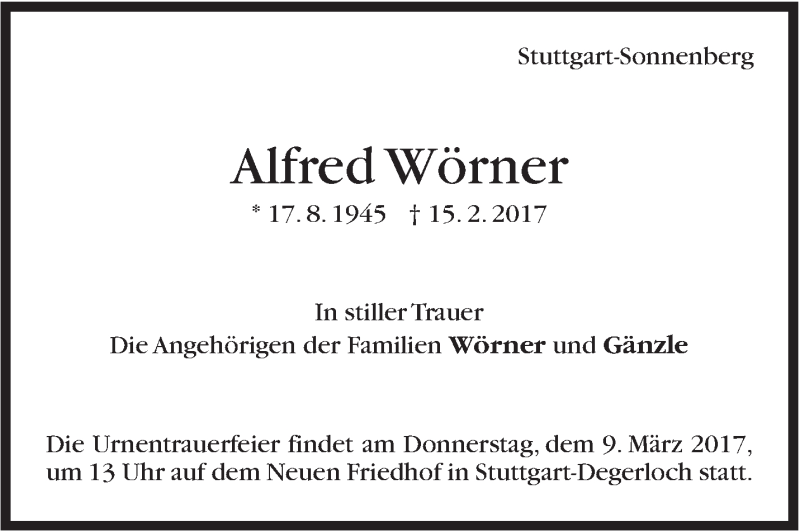 Hier finden Sie alle Traueranzeigen aus der Zeitung, die bisher für Alfred Wörner erschienen sind. Weitere Traueranzeigen, die in der Zeitung erscheinen, werden hier ebenfalls aufgelistet