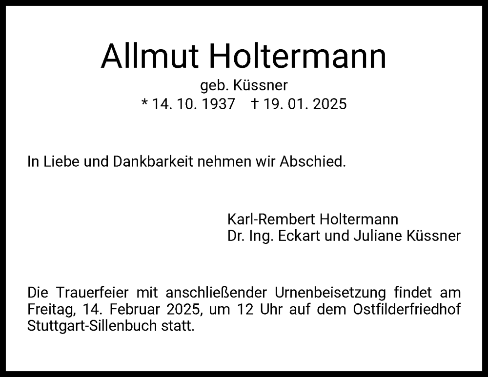 Hier finden Sie alle Traueranzeigen aus der Zeitung, die bisher für Allmut Holtermann erschienen sind. Weitere Traueranzeigen, die in der Zeitung erscheinen, werden hier ebenfalls aufgelistet