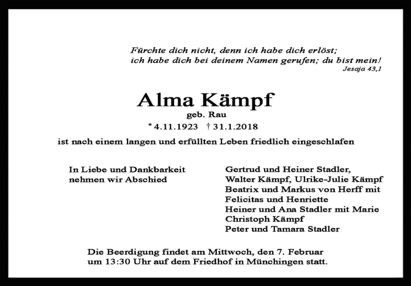Hier finden Sie alle Traueranzeigen aus der Zeitung, die bisher für Alma Kämpf erschienen sind. Weitere Traueranzeigen, die in der Zeitung erscheinen, werden hier ebenfalls aufgelistet