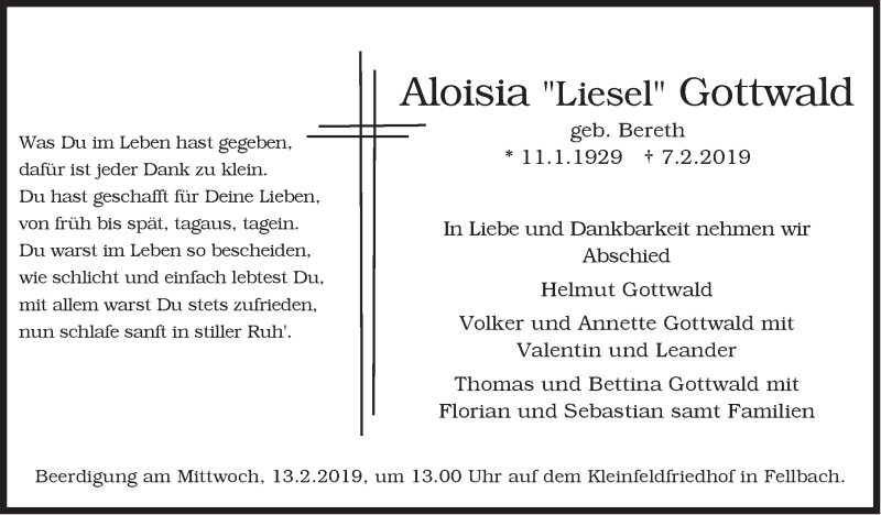 Hier finden Sie alle Traueranzeigen aus der Zeitung, die bisher für Aloisia Gottwald erschienen sind. Weitere Traueranzeigen, die in der Zeitung erscheinen, werden hier ebenfalls aufgelistet