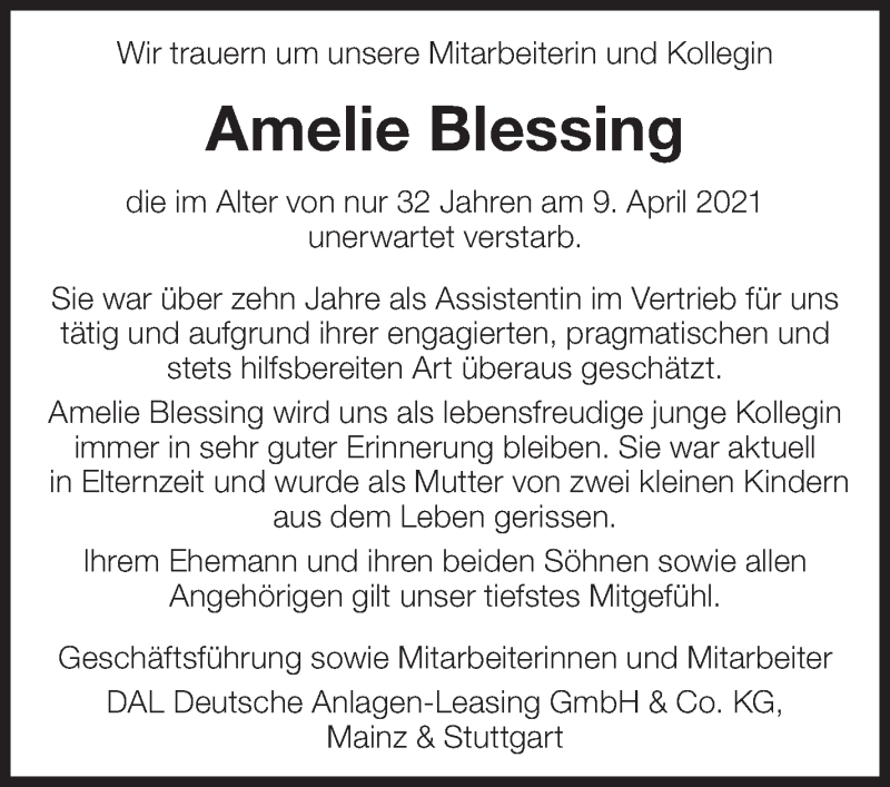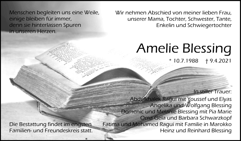 Hier finden Sie alle Traueranzeigen aus der Zeitung, die bisher für Amelie Blessing erschienen sind. Weitere Traueranzeigen, die in der Zeitung erscheinen, werden hier ebenfalls aufgelistet