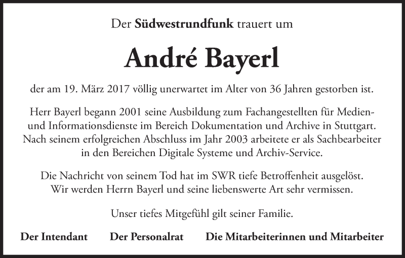 Hier finden Sie alle Traueranzeigen aus der Zeitung, die bisher für André Bayerl erschienen sind. Weitere Traueranzeigen, die in der Zeitung erscheinen, werden hier ebenfalls aufgelistet