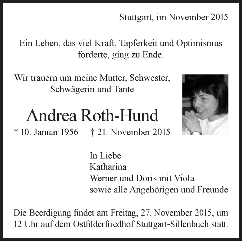 Hier finden Sie alle Traueranzeigen aus der Zeitung, die bisher für Andrea Roth-Hund erschienen sind. Weitere Traueranzeigen, die in der Zeitung erscheinen, werden hier ebenfalls aufgelistet