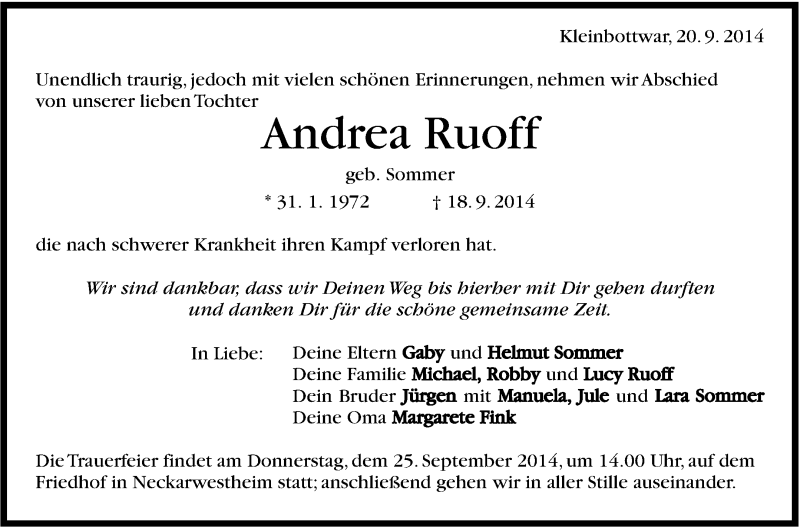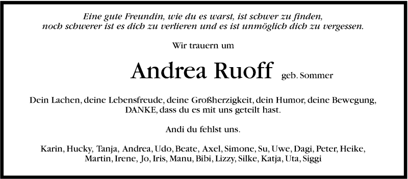 Hier finden Sie alle Traueranzeigen aus der Zeitung, die bisher für Andrea Ruoff erschienen sind. Weitere Traueranzeigen, die in der Zeitung erscheinen, werden hier ebenfalls aufgelistet