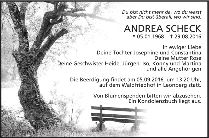 Hier finden Sie alle Traueranzeigen aus der Zeitung, die bisher für Andrea Scheck erschienen sind. Weitere Traueranzeigen, die in der Zeitung erscheinen, werden hier ebenfalls aufgelistet