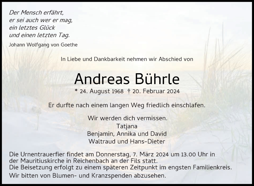 Hier finden Sie alle Traueranzeigen aus der Zeitung, die bisher für Andreas Bührle erschienen sind. Weitere Traueranzeigen, die in der Zeitung erscheinen, werden hier ebenfalls aufgelistet