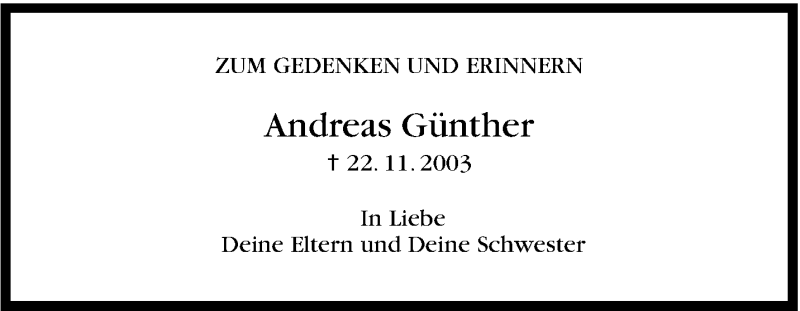 Hier finden Sie alle Traueranzeigen aus der Zeitung, die bisher für Andreas Günther erschienen sind. Weitere Traueranzeigen, die in der Zeitung erscheinen, werden hier ebenfalls aufgelistet