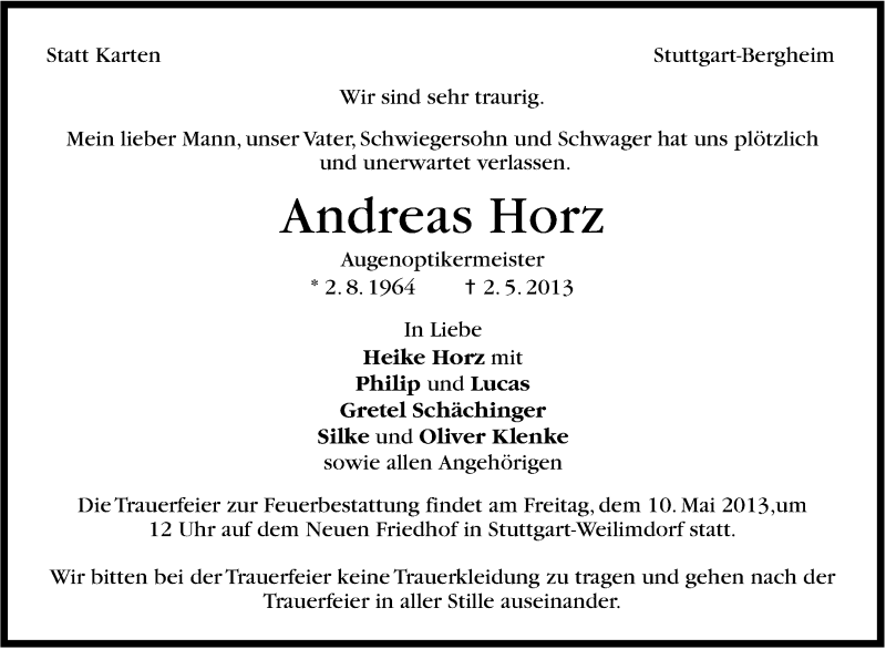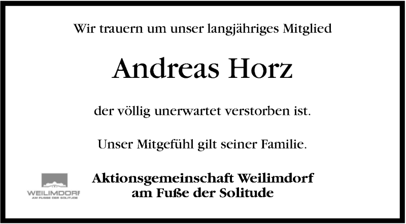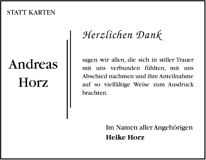 Hier finden Sie alle Traueranzeigen aus der Zeitung, die bisher für Andreas Horz erschienen sind. Weitere Traueranzeigen, die in der Zeitung erscheinen, werden hier ebenfalls aufgelistet