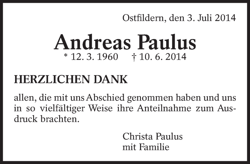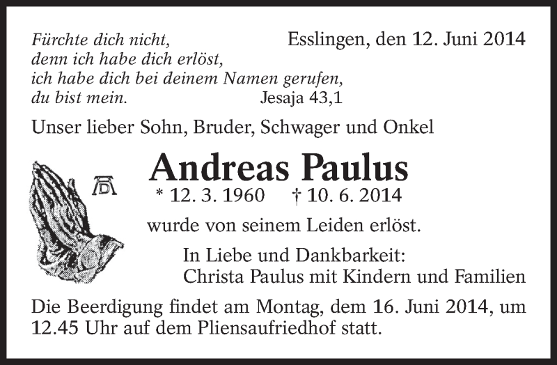 Hier finden Sie alle Traueranzeigen aus der Zeitung, die bisher für Andreas Paulus erschienen sind. Weitere Traueranzeigen, die in der Zeitung erscheinen, werden hier ebenfalls aufgelistet